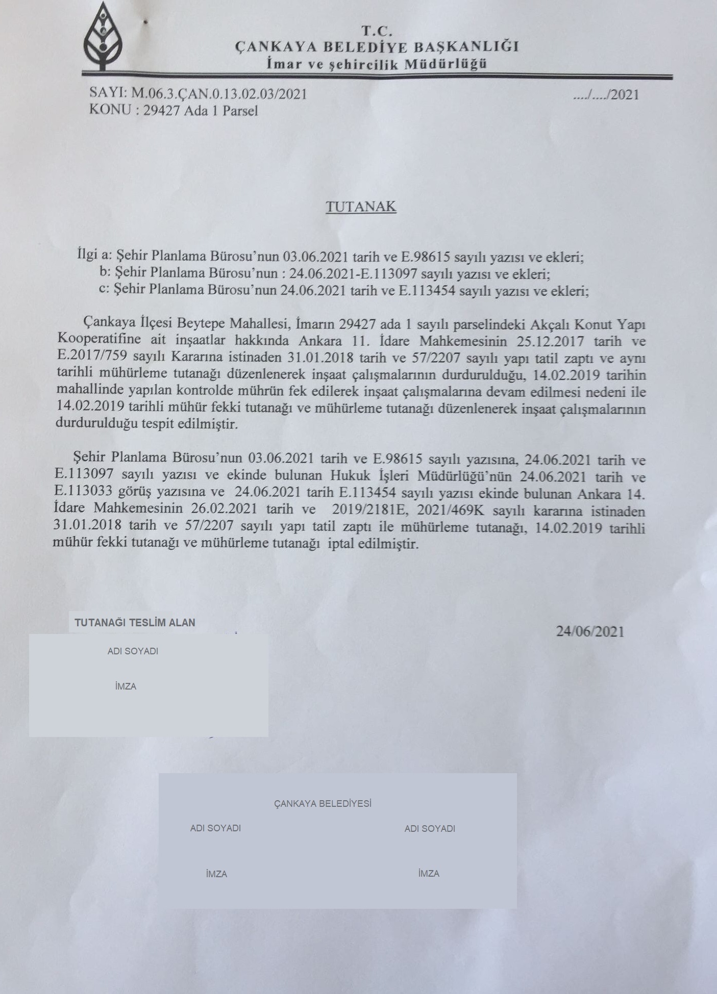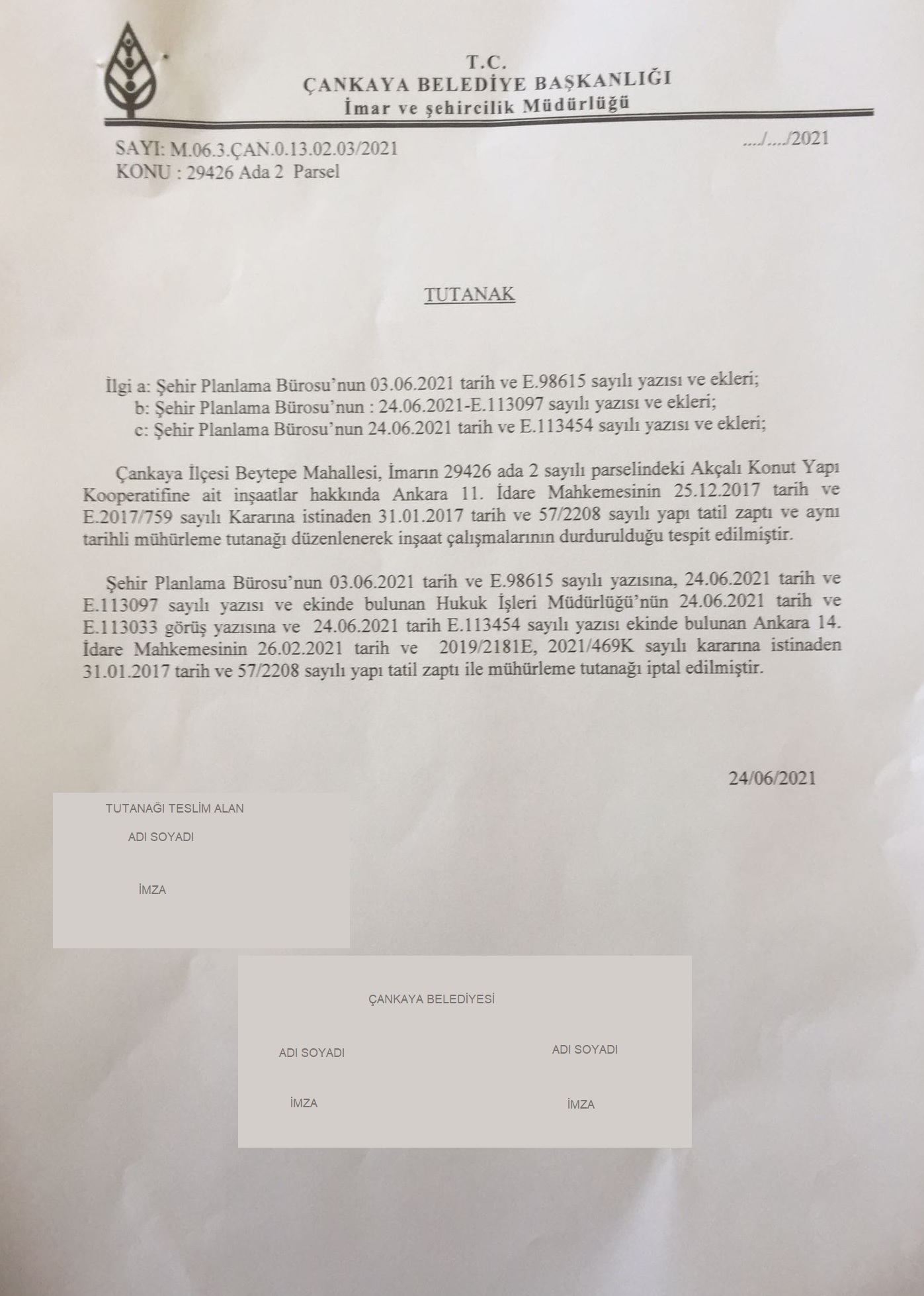 Değerli Ortaklar, Çankaya Belediyesine “mühürleme işleminin kaldırılması” istemiyle yaptığımız başvurunun reddine dair 08/08/2019 tarihli ve 36290 sayılı kararına karşı açtığımız davada Ankara 14. İdare Mahkemesi 26/02/2021 tarihinde İPTAL KARARI vermiştir. Karar gereğince mühürleme işleminin derhal kaldırılması için kooperatifimiz adına belediyeye yazılı başvuru yapılmıştır.